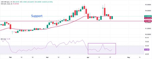 Aus technischer Sicht zeigt sich eine leichte Erholung des USD/INR-Paares. Nach den Verlusten vom Freitag konnte sich der Kurs wieder stabilisieren und nähert sich der Marke von 93,00. Damit liegt er erneut nahe am 20-Tage-EMA, der aktuell bei etwa 93,05 verläuft.